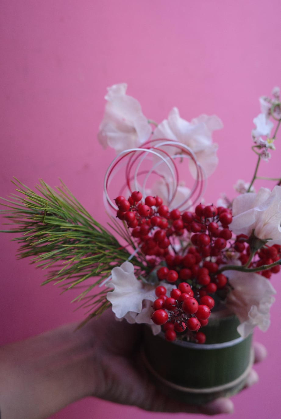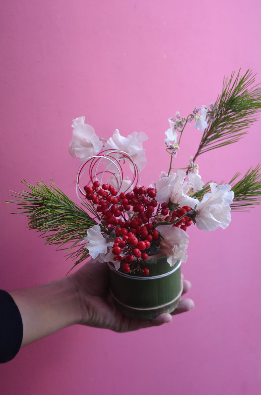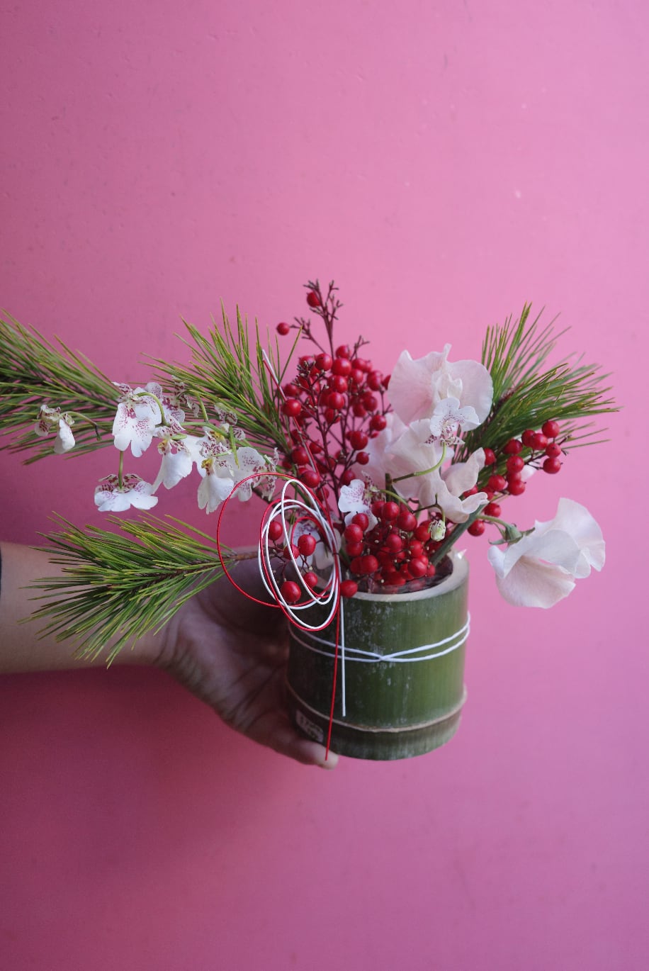 竹の器に、花をあしらいました。吸水性のスポンジにアレンジしていますので、お水を注いでいただくとながくみていただけます。心のこもったお正月の雰囲気を演出します。